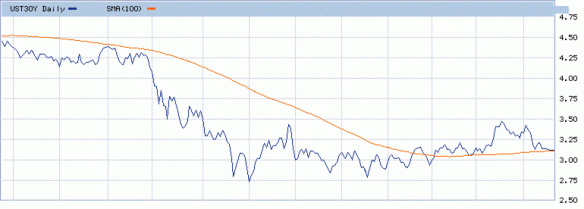 Percent daily yield (blue) and 100-day SMA (red) for 30-year U.S. Treasury during the year ending April 20, 2012 (Source/The Wall Street Journal).